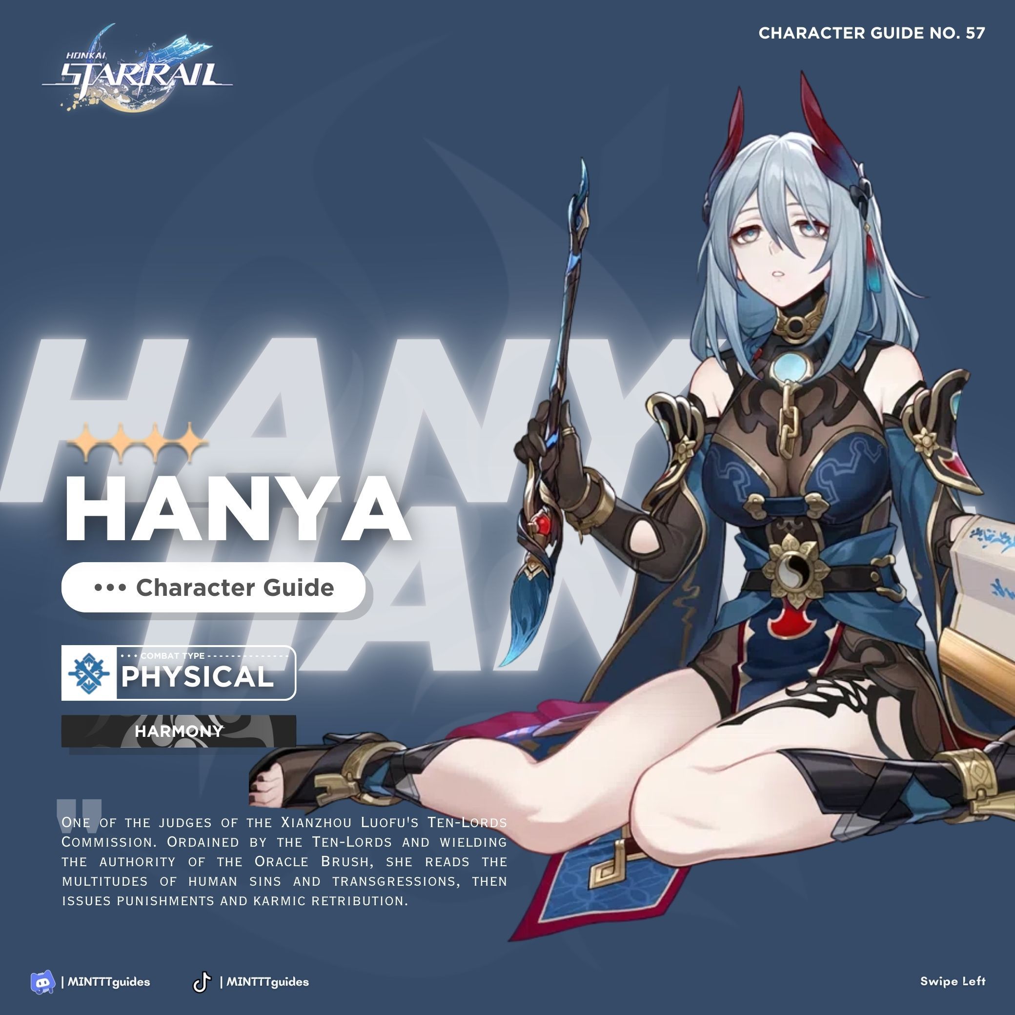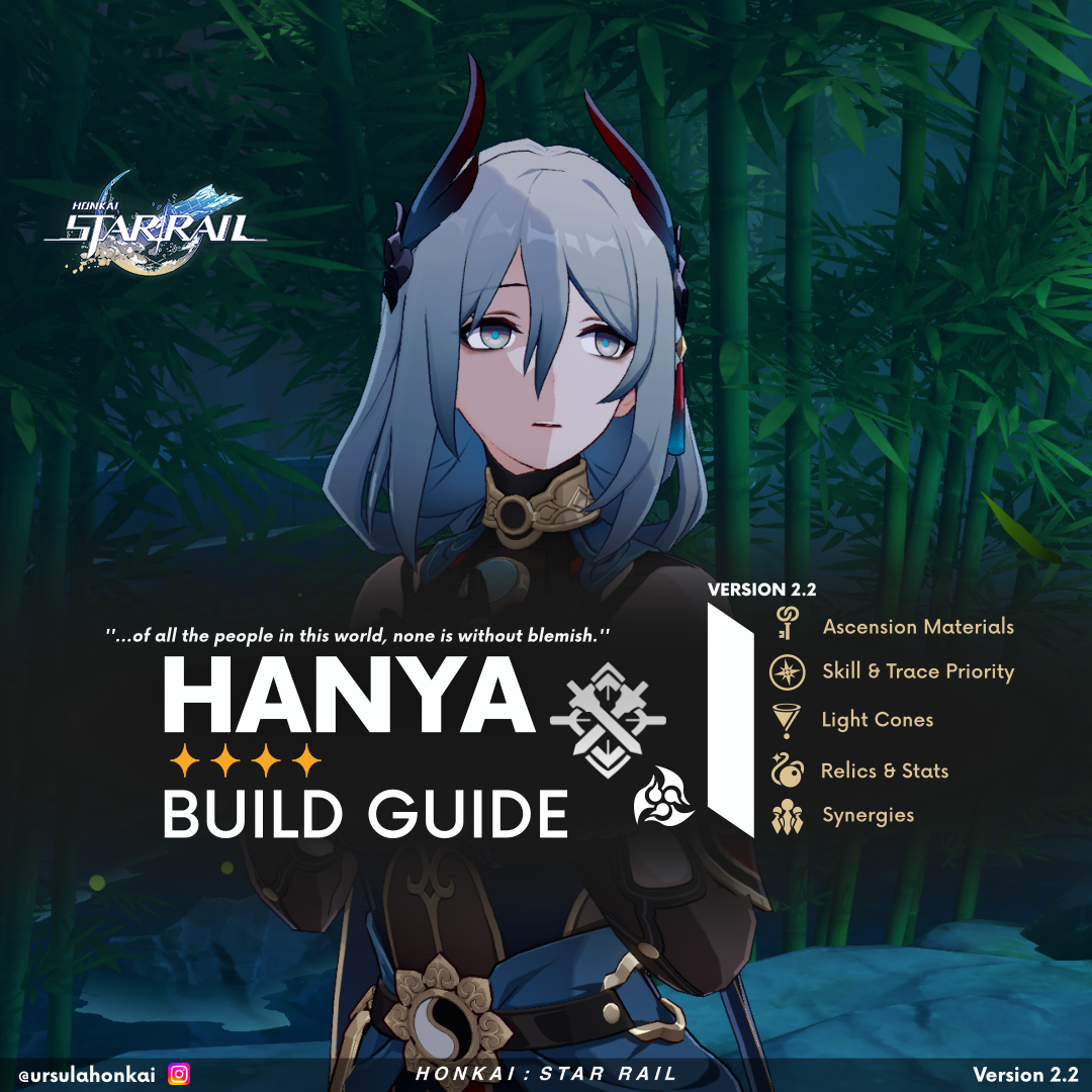 . This will increase her Energy Regeneration Rate by 10% and regenerate 1 Skill Point when Hanya. Hanya Kit, Leveling Mats, Builds (Relics, Light Cones, Traces priority, recommended Stats) and best Teams in Honkai: Star Rail